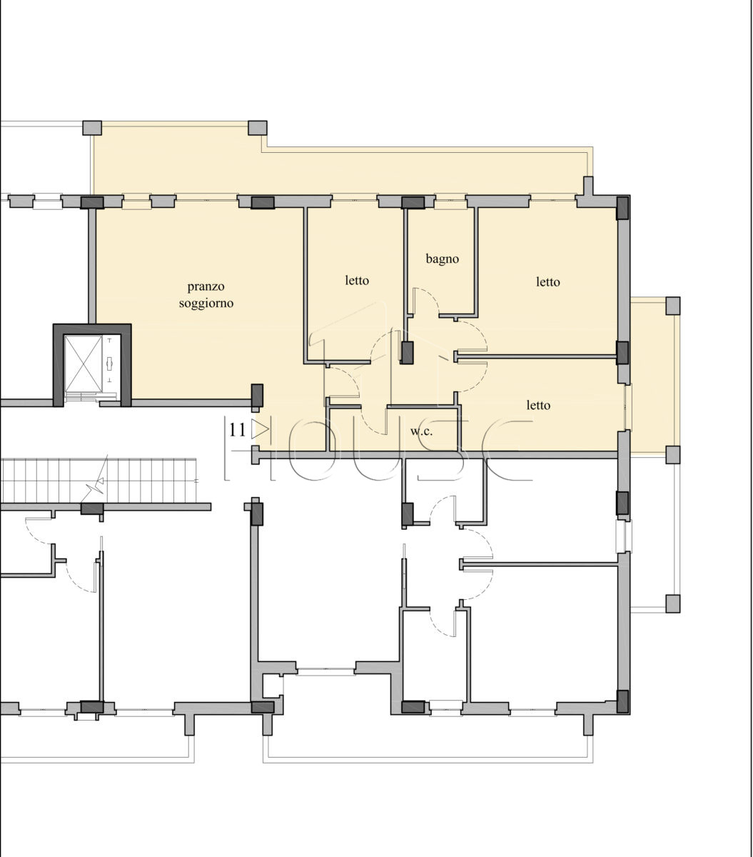- ingresso, soggiorno con angolo cottura, 3 camere, 2 bagni, terrazzo abitabile e terrazzino.