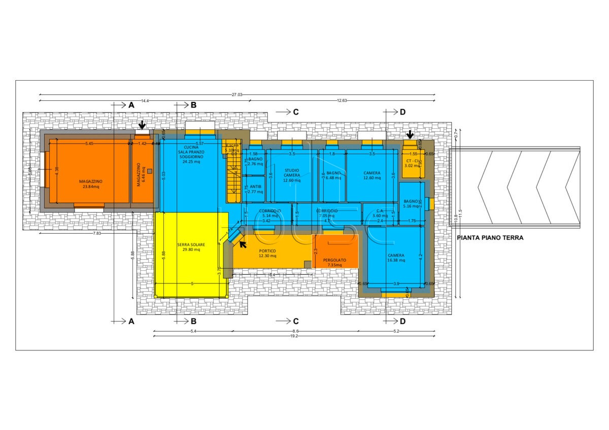 Oltre a portici e magazzino a piano terra; ampia taverna con bagno, fondo e garage al piano seminterrato.